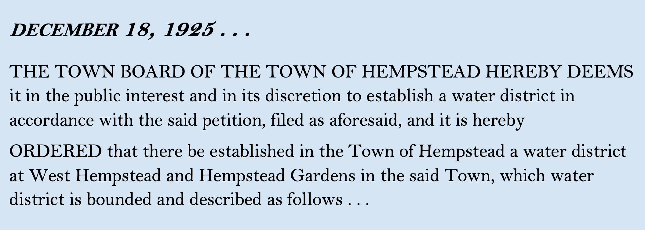 For 18 months prior to the District’s formation, community meetings were held in the local schoolhouse. The issue at hand was the possibility of gaining a $300,000 bond issued (over $5.5 million today) as well as successfully providing the Town of Hempstead with a petition containing the signatures of property owners constituting at least 51% of the total assessed valuation of the territory involved.